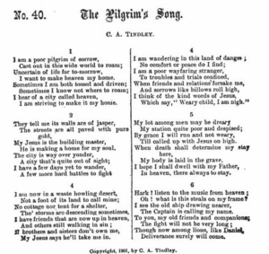 “Poor Pilgrim of Sorrow” (which may well have the same origins) began it’s life in the 19th century as a sacred hymn by C.A. Tindley and was then called “The Pilgrim’s Song.” This version was published and copyrighted in 1901. “Poor Pilgrim of Sorrow” is now performed widely as an American folk hymn. It depicts a weary traveler navigating a harsh world, while hoping to find a home in heaven. It is known for its plaintive, sometimes unaccompanied, style, expressing deep themes of mourning and spiritual resilience. It focuses on struggle, earthly suffering, the temptation to despair (“sometimes I’m tossed and driven”), and the ultimate hope of rest in “a city called heaven.”